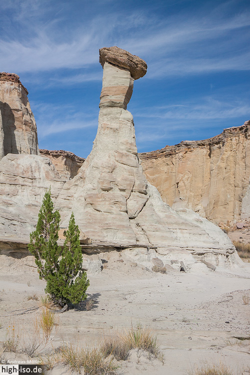 GPS-Position: 1. Hoodoo Gruppe GPS-Position: 2. Hoodoo Gruppe GPS-Position: Hoodoo HauptgruppeDie erste Hoodoo Gruppe befindet sich direkt am Westrand und beeindruckt durch einen großen und dicken Hoodoo. Die zweite Gruppe versteckt sich etwas hinter den Wänden und der Zugang ist nicht gleich offensichtlich. Um diese Gruppe zu erreichen muss man einen kleinen Umweg um einen kleinen "Wald" herum einschlagen. Die zweite Gruppe ist gekennzeichnet durch viele kleine Hoodoos. Doch die schönste Gruppe ist eindeutig die dritte Hoodoo Gruppe. Die White Ghost's, wie die Wahweap Hoodoos auch genannt werden, sehen wirklich wie kleine Gespenster aus!