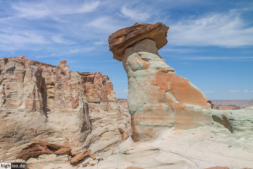 Am Stud Horse Point findet man auch wieder Hoodoos. Diese unterscheiden sich jedoch erheblich von den Wahweap Hoodoos. Dieses kleine Gebiet kann man ganz einfach von der US-89 aus erreichen. Von Page kommend biegt man ca. 5 bis 6 Meilen hinter dem Glen Canyon Staudamm in eine kleine Service Road ab. Die Straße ist zwar geteert, aber hat Schlaglöcher ohne Ende. Ab hier geht es dann über Dirtroads bis zum Stud Horse Point hinauf. Allerdings benötigt man definitiv (zumindest als wir da waren) einen 4WD (Allrad), da es einige sehr sandige und steile Passagen zu überwinden gilt. Die Anfahrt ist in Worten schwer zu beschreiben, daher gibt es hier einen GPS-Track für Google Earth.