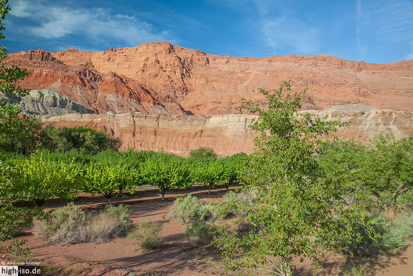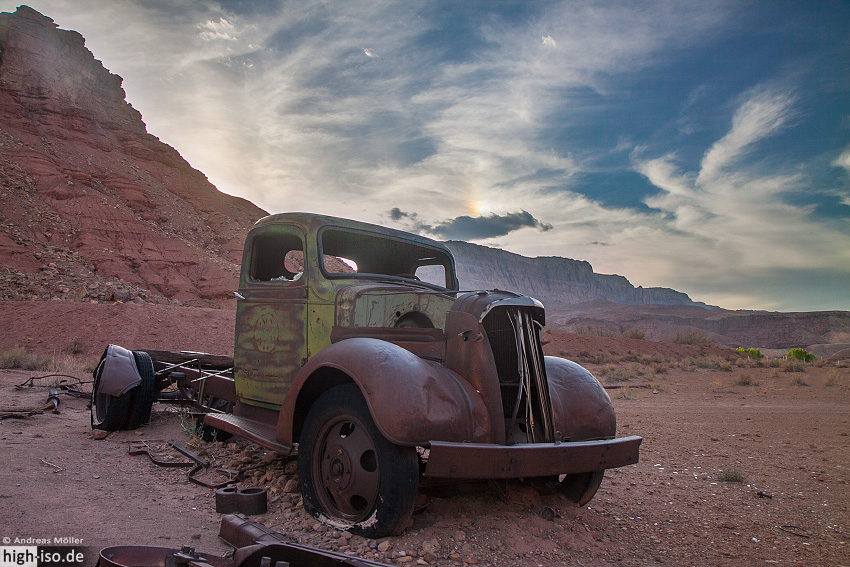 Dann fuhren wir zur Lonely Dell Ranch. Dieses kleine grüne "Dorf" liegt zwischen den roten Canoyonwänden der Vermillion Cliffs und zeigt wie die Mormonen hier damals gelebt hatten. Die Häuser sind noch von früher erhalten und wurden restauriert. Auch die Bewässerungsanlage des Gartens funktioniert noch genauso wie früher. Wer etwas tiefer in den Canyon hineingeht findet noch einen Friedhof sowie ein altes Autowrack. Außerdem lachte uns eine sogenannte Nebensonne an. (4. Foto unten)