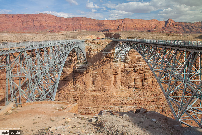 Zur Navajo Bridge kommt man, indem man die US-89 am Horseshoe Bend vorbei in Richtung Süden fährt. An der T-Kreuzung zur 89A fährt man nach rechts und gelangt direkt zu den beiden stählernen Brücken. Die beiden Brücken sind mit ihren ca. 250m Länge eine wichtige Verbindungsstrecke über den Colorado River. Sie bilden die Grenze zum Grand Canyon Nationalpark welcher auf der westlichen Seite der Brücken beginnt. Am nördlichen Ende befindet sich ein Visitor Center, oder besser gesagt ein Souvenir Store.