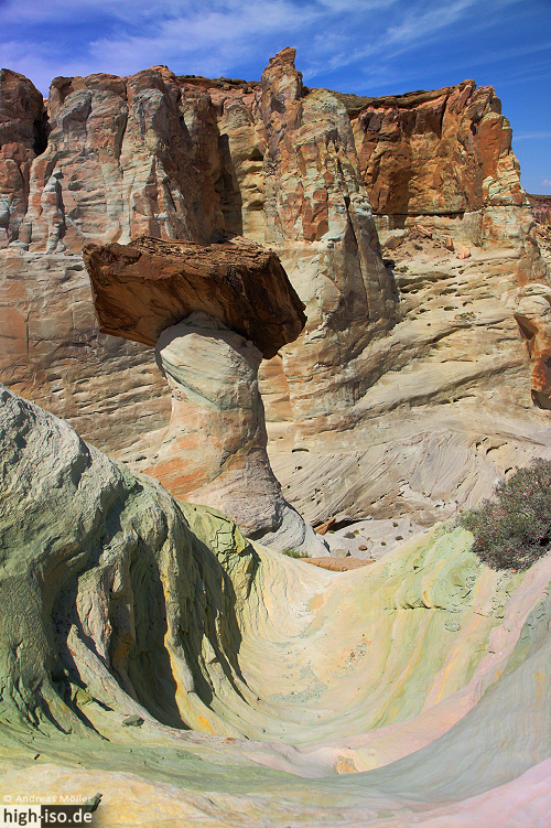 Vor Jahren fiel hier einst ein riesiger Felsbrocken den Berg hinab. Wind und Wasser trugen den Boden unter dem Fels ab und so entstand dieser gewaltige Hoodoo.